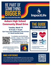 Auburn High School Community Blood Drive-Tuesday 3/10 from 8:15am-1:15pm at the school 511 North St in Auburn-enter thru main High School door. Appointments are requested. Please call Mrs. Ladage at 217-438-6817 or ImpactLife at 800-747-5401 to schedule.
