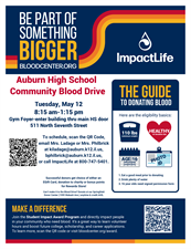 Auburn High School is hosting a Community Blood Drive on Tuesday 5/12 from 8:15am-1:15pm in their Gym Foyer-enter thru Main HS Door at 511 N. Seventh St. Appointments are requested. Please call ImpactLife to schedule at 800-747-5401.
