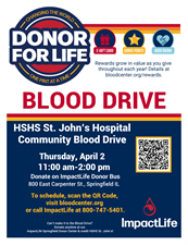 HSHS St. John's Hospital is hosting a Community Blood Drive on Thursday 4/2 from 11am-2pm on our ImpactLife Donor Bus in their Parking Lot at 800 East Carpenter Street in Springfield. Appointments are requested. Please call ImpactLife to schedule at 800-747-5401.