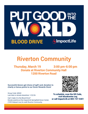Riverton is hosting a Community Blood drive on Thursday, 3/19 from 3pm-6pm at Riverton Community Hall at 1200 Riverton Road. Appointments are requested. Please call ImpactLife to schedule at 800-747-5401.