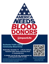 Rochester Public Library is hosting a Community Blood Drive in their Community Room at #1 Community Drive on Wednesday 12/10 from 1pm-5pm. Appointments are requested. Please call ImpactLife to schedule at 800-747-5401.