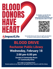 Rochester Public Library is hosting a Community Blood Drive on Wednesday 2/18 from 2-6pm in the Community Room at #1 Community Drive. Appointments are requested. Please call ImpactLife to schedule at 800-747-5401.