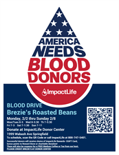 Springfield's Brezie's Roasted Beans is hosting their Monthly Community Blood Drive Week from Monday 2/2 thru Sunday 2/8 at our ImpactLife Donor Center in Springfield at 1999 Wabash Ave. Appointments are not required however, if you would like to schedule for a particular day or time during the week, please call ImpactLife at 800-747-5401.