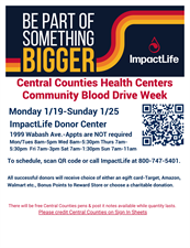 Central Counties Health Centers is hosting their Quarterly Community Blood Drive Week from Monday 1/19-Sunday 1/25 times vary per day of week at our Springfield ImpactLife Donor Center at 1999 Wabash Ave. Appointments are NOT required at our Donor Centers however, if you would like to schedule for a particular day/time slot, please call ImpactLife at 800-747-5401.