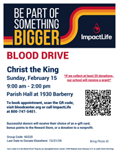 Christ the King will host a Community Blood Drive on their campus in Parish Hall at 1930 Barberry in Springfield on Sunday 2/15 from 9am-2pm. Appointments are requested. Please call ImpactLife at 800-747-5401 to schedule.