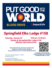 Springfield Elks Lodge #158 is hosting a Community Blood Drive at the Lodge (409 East Lake Shore Drive) from 9am-Noon on Saturday 1/24. Appointments are requested. Please call Christi Sullivan at 217-529-0158 or ImpactLife at 800-747-5401 to schedule.