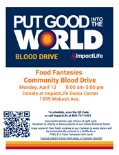 Springfield's Food Fantasies will be hosting a Community Blood Drive on Monday 4/13 from 8am-5pm at our ImpactLife Springfield Donor Center at 1999 Wabash Ave. Appointments are not required however, if you would like to schedule for a particular time, please call ImpactLife at 800-747-5401.