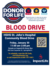 HSHS St. John's Hospital in Springfield is hosting a Community Blood Drive on Friday 1/30 for 11am-2pm in the hospital parking lot on our ImpactLife Donor Bus at 800 East Carpenter St. Appointments are requested. You may call ImpactLife to schedule at 800-747-5401.