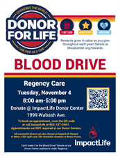 Regency Care of Springfield is hosting their Quarterly Community Blood Drive from 8am-5pm at our ImpactLife Donor Center (1999 Wabash Ave.) on Tuesday 11/4. Appointments are NOT required however, if you would like to schedule for a particular time slot, please call ImpactLife at 800-747-5401.