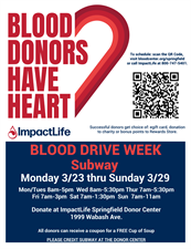 Our Springfield Subways are hosting their Monthly Community Blood Drive Week from Monday 3/23 thru Sunday 3/29 at our ImpactLife Donor Center located at 1999 Wabash Ave. Times will vary per day of the week. Appointments are not required at our Donor Centers however, if you would like to schedule for a particular time/day, please call ImpactLife at 800-747-5401.