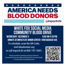 Springfield's White Fox Social Media is hosting a Community Blood Drive on Wednesday, 12/3 from 8am-5:30 pm at our ImpactLife Springfield Donor Center at 1999 Wabash Ave. Appointments are not needed however, if you would like to scheduled for a particular time slot, please call ImpactLife at 800-747-5401.