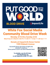 White Fox Social Media is hosting a Community Blood Drive Week Monday 3/16 thru Sunday 3/22 at our ImpactLife Donor Center at 1999 Wabash Ave. Times will vary per day of the week. Appointments are not required at our Donor Centers however, if you would like to schedule for a particular day/time, please call ImpactLife at 800-747-5401.